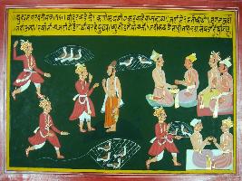 | Description / विवरण | Miniature painting based on Mahabharat - Udyam parva depicting Vidur is telling that one day vyadh catches birds by nets, among them two birds fled with the net and the vyadh runs behind them. |