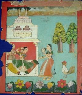 | Description / विवरण | Miniature painting depicting a Nayika dressing herself. A female attendant is bringing mirror for her. Another female attendant is seen behind her. Lotus flowers seen in the pond at the bottom. |