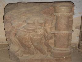 | Description / विवरण | A sculptured architectural fragment of a female figure a chanwari bearer, standing in tribhanga, in a niche. The right arm is broken and holding the tussle of her drapery with the left hand. The upper part from the head is mutilated. She is wearing necklace with a long tussle, bracelet, girdle with hanging tussels. |