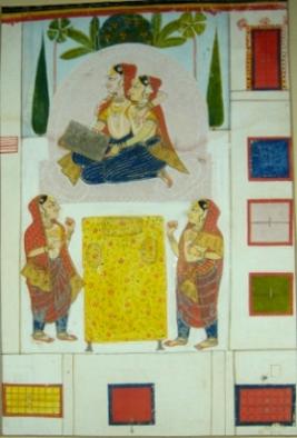 | Description / विवरण | Miniature painting depicting Nayika sitting with her friend and two female attendants standing. The painting is unfinished. |