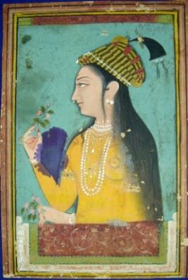 | Description / विवरण | Bust size portrait of Nurjahan facing right, holding flowers in her hands. She is wearing a turban with a kalgi and adorned with jewels. |
