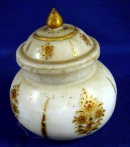 | Description / विवरण | Pot with lid made of marble having vertical rim, broad neck, round body and circular flat base. It is decorated with golden floral designs. |