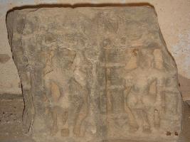 | Description / विवरण | A sculptured architectural fragment, depicting two male figures in two niches, separated by pillars. Both are standing in tribhanga pose, the figure on the right has right hand resting on thigh and the other figure has the left hand on the thigh. In the other hand they are holding something, which are not clear. |