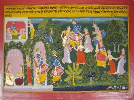 | Description / विवरण | Miniature painting based on Geet Govind depicting Raas Lila of Lord Vishnu. In it Krishna dancing with various women. |