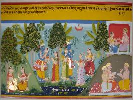 | Description / विवरण | Miniature painting based on Geet Govind, it is a scene of Krishna making Lila in Vrindavan and it is depicted in centre. On corners peoples depicted talking to each other. |