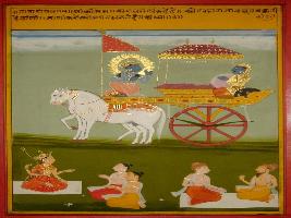 | Description / विवरण | Miniature painting based on Shri Bhagwat Gita depicting Krishna preaching Arjun this whole world relies on my nature. |