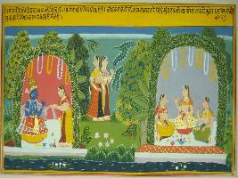 | Description / विवरण | Miniature painting based on Geet Govind depicting Krishna and Radha in the right side of the painting while two gopis are in the centre and Radha is seen with two female are seen in the left side. |