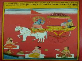 | Description / विवरण | Miniature painting based on Shri Bhagwat Gita. It depicts Krishna preaching Arjun that the earth, water, fire, air, mind, intelligence, proud all are the characteristics of him only. |