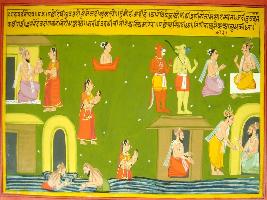 | Description / विवरण | Miniature painting based on Mahabharat - Gada parva. It is a scene on the bank of a river. Ashrams of rishis are built on the bank of river a woman is depicted with her child. A king is depicted praying a rishi. Two demons are aslo depicted. |
