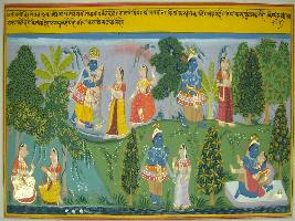 | Description / विवरण | Miniature painting based on Geet Govind, it is a scene from Vrindavan where Krishna is depicted making love with Radha. |