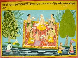 | Description / विवरण | Miniature painting based on Mahabharat - Gada parva, Baldev is depicted bathing in the river, Many rishis are depicted holding Vedas or scripture and many sages also taking bath in the river. |