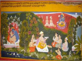 | Description / विवरण | Miniature painting based on Geet Govind. Where Vishnu is seen at the top and Jaidev is seen in the centre that taking about the holy loving union of Radha and Krishna. |