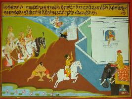 | Description / विवरण | Miniature painting based on Prithviraj Raso depicting Chandvardai telling Prithviraj about elephant that he found near Ganga river and it belongs to king Jaichand, two wrestlers are also depicted near the fort. |