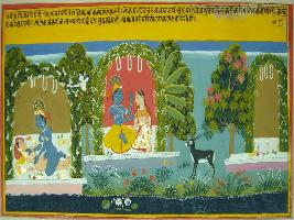 | Description / विवरण | Miniature painting based on Geet Govind depicting loving union of Krishna and Radha black buck standing at some distance. |