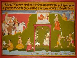 | Description / विवरण | Miniature painting based on Prithviraj Raso depicting is marching on the bank of river Ganga where he saw some are fighting some are doing yagna a king is giving donation equal to his weight. |