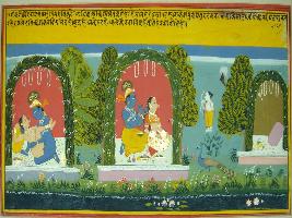 | Description / विवरण | Miniature painting based on Geet Govind depicting loving union of Krishna with Radha and Peacock standing at some distance. |