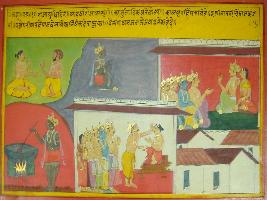 | Description / विवरण | Miniature painting based on Mahabharat - Mahaprasthan parva depicting on the upper right Vaispayana telling Janmejaya, that after hearing the end of yaduclan Yudhisthir says all this happened with the time and ask Arjun not to think about it. On the upper centre Kala is depicted. At the lower centre coronation of Parikshit is depicted. |