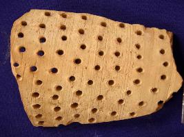 | Description / विवरण | A perforated potsherd. It is a part of the perforated jar that is used by the harappans, the specific use of the jar is not identified yet, though many theories are floating. The use of this kind of pottery is confined only to harappans. |