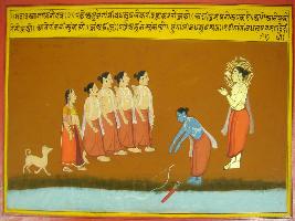 | Description / विवरण | Miniature painting based on Mahabharat - Mahaprasthan parva depicting Arjun trying to take out Gandiva from water on their way to heaven. Then Agni appeared and ask Arjun to renounce the Gandiva on it in the property of Varun. |