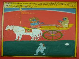 | Description / विवरण | Miniature painting based on Shri Bhagwat Gita. It depicts Krishna preaching Arjun that on dhumkatri of Krishna paksha, for six month, do the Dakshprayan and then you will get brightness like that of Chandrama. Yogi will go behind you. |