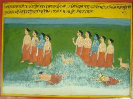| Description / विवरण | Miniature painting based on Mahabharat - Mahaprasthan parva depicting Pandavas are walking in Himalaya. At first Draupadi fall down on the earth, then Bhim says Yudhisthir about that. After that Sahdev fall down on earth. After that Yudhisthir, Bhim, Arjun and Nakul continued their journey. |