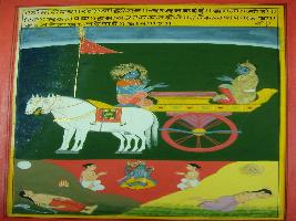 | Description / विवरण | Miniature painting based on Shri Bhagwat Gita. It depicts Krishna preaching Arjun that during daytime of Shukla paksha for six month worship god with Agni and Jyoti. Then, you will see god in his Kaal form. You will get Brahm. |