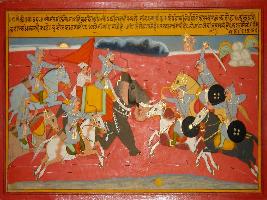 | Description / विवरण | Miniature painting based on Prithviraj Raso depicting Meer running after Prithviraj to catch him as if arrows come out from the bow and rays of sun tears the darkness. |