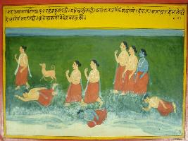 | Description / विवरण | Miniature painting based on Mahabharat - Mahaprasthan parva depicting first Nakul fall down on earth, after that Arjun then Bhim says Yudhisthir that his brothers has fall down. At the moment Bhim also fall down and sound of falling of Bhim spread all over earth and sky. After that Yudhisthir alone with the dog continued his journeys. |
