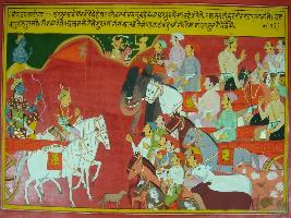 | Description / विवरण | Miniature painting based on Mahabharat - Virat parva depicting by seeing Arjun Drona says to Duryodhan and Bhishma that this is Arjun, who will defeat in the way Bhavani defeat Sumbha and Nishumbha. The whole world is shaking and jackle are howling as if Kala speaks, due to the arrival of Arjun. |