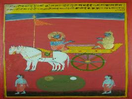 | Description / विवरण | Miniature painting based on Shri Bhagwat Gita. It depicts Krishna preaching Arjun that those who move in all three kaal, would be called as kaal. |