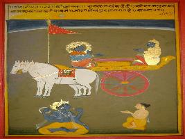 | Description / विवरण | Miniature painting based on Shri Bhagwat Gita. It depicts Krishna preaching Arjun, the person, who worship whole universe his worship is pure and he is the absolute man on earth. |