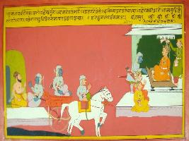 | Description / विवरण | Miniature painting based on Mahabharat - Musal parva depicting Arjun taking leave from Vyas Rishi at the right part. He left on his chariot to Hastinapur. Then he went to meet Yudhisthir and touches his feet. Yudhisthir asked him to tell news of Dwarika. Yudhisthir is depicted sitting on couch with chori bearer. Arjun is shown coming to him. |
