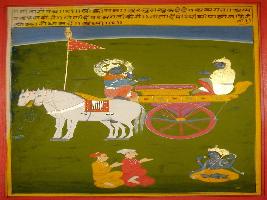 | Description / विवरण | Miniature painting based on Shri Bhagwat Gita. It depicts Krishna preaching Arjun that which is expressionless is Brahma and one who get this will attain paramgati so one should not ignore and deny this. |