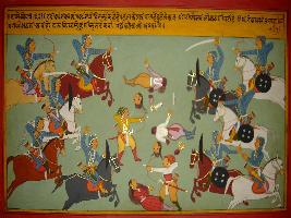 | Description / विवरण | Miniature painting based on Prithviraj Raso depicting Kankakee asking Purohit Kaan to go in search of Prithviraj as he alone cannot face the army of Panga king. |