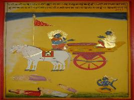 | Description / विवरण | Miniature painting based on Shri Bhagwat Gita. It depicts Krishna preaching Arjun that one who does not get destructed after death also, will get the moksha. |