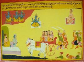 | Description / विवरण | Miniature painting based on Mahabharat - Musal parva. Arjun is depicted with Vyas and he had brought women forcefully and no one is able to stop him, not even Indra is able to stop him and Krishna already had made his holy departure, now it is only Vishnu who can be able to stop him. |