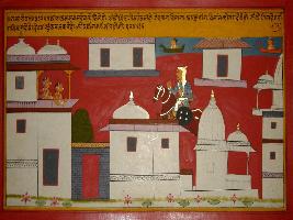 | Description / विवरण | Miniature painting based on Prithviraj Raso depicting Prithviraj coming to Kannauj on horseback while Sanjogita is noticing him from palatial balcony along with her friend. |