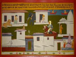 | Description / विवरण | Miniature painting based on Prithviraj Raso. The painting shows that Prithviraj entered into the city and noticed the beautiful temples and people are doing their work peacefully. One elephant, horse and a tiger is seen by him. While Sanjogita is seen on the palatial balcony. |