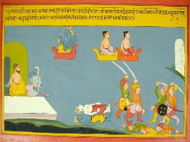 | Description / विवरण | Miniature painting based on Mahabharat - Musal parva depicting Vyas talking to Arjun at the extreme right. He told him that Krishna went to Swaraga with Balram and other sardar of his time at upper part. One of Yadava son Pana took their place and was very brave. Pana got killed in war. At the lower left part, Yadava are being depicted fighting among themselves. |