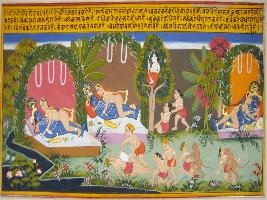 | Description / विवरण | Miniature painting based on Geet Govind depicting loving union of Radha and Krishna. It elaborates the moment of their mating. |