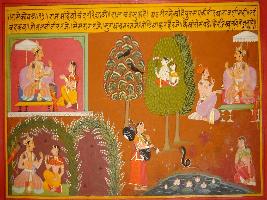 | Description / विवरण | Miniature painting based on Prithviraj Raso depicting that king Maishi come to Chand and telling him about the happiness in the meeting of male and female in Sath season. |