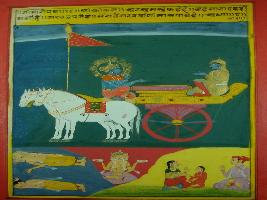 | Description / विवरण | Miniature painting based on Shri Bhagwat Gita. It depicts Krishna preaching Arjun that in one day in life of Brahma everything get generated and in one night every living being get destructed. |