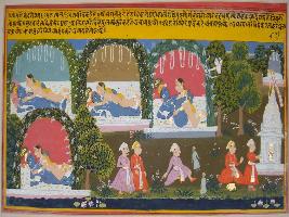 | Description / विवरण | Miniature painting based on Geet Govind depicting loving union and holy mating of Radha and Krishna. |