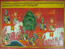 | Description / विवरण | Miniature painting based on Mahabharat - Virat parva depicting when Uttar ask where are Pandavas then Arjun did meditation on his chariot. When the chariot come he ask Uttar to sit on the seat of chariot driver. The painting also the seat of chariot driver. The painting also depict the flag of the Arjun chariot, which has the symbol of Hanuman. |