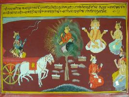 | Description / विवरण | Miniature painting based on Mahabharat - Virat parva depicting Uttar climb on the tree to get the Gandiva of Arjun. Uttar ask Arjun about Gandiva and Arjun replied that Gandiva remains with Brahma for 1000 years, the Dakshya took it, after that Indra Kept it for 1000 years, then Chandrama get it for 500 years, and Varun kept it for 100 years who lastly gave it to Arjun who used it for 65 years. |