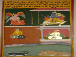 | Description / विवरण | Miniature painting based on Sarangadhar depicting Vishnu seated on a throne and his vehicle Garuda is seated in front of him. On the middle part of the painting, a king and a soldier are depicted and on the lower part a lion and deer are depicted. |