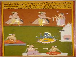 | Description / विवरण | Miniature painting based on Sarangadhar depicting two men sitting at the lower panel. Above this, Vishnu is shown sitting lotus. At the upper panel king is shown coming. |