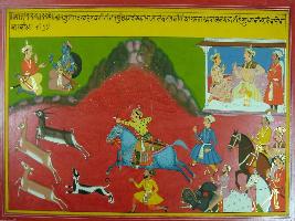 | Description / विवरण | Miniature painting based on Mahabharat - Adi parva depicting that Arjun is talking to a Gandharva. It says that king Shravan goes on deer hunting in jungle and kills them. |