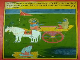 | Description / विवरण | Miniature painting based on Shri Bhagwat Gita. It depicts Krishna preaching Arjun that consciousness becomes immortal after stopping all doors. Through Yoga meditation one can stabilised their sons. |