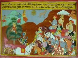 | Description / विवरण | Miniature painting based on Mahabharat - Virat parva depicting Drona telling Duryodhan that suddenly dark accures, jackles are holding horses are crying and the lady who is driving the chariot of prince Uttar scenes like Arjun who is coming to fight with us in the disguise of a woman in the way Shiv fight in the disguise of a Bhil. |